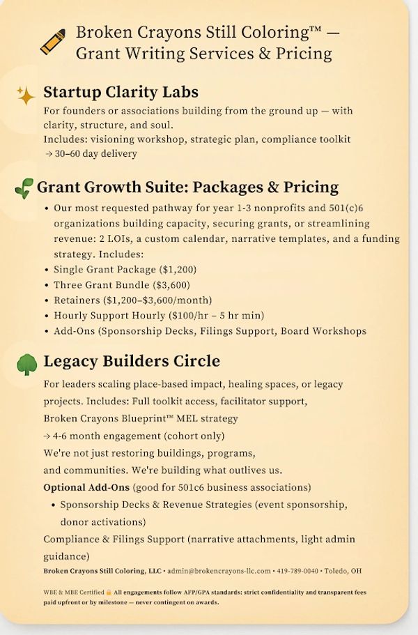 Complete our Comprehensive Grant Development Questionnaire to help us understand your goals, programs, and funding needs. Weβll match you with the best-fit tools and strategies using our Broken Crayons Blueprintβ’ β so you can grow with purpose, not pressure.