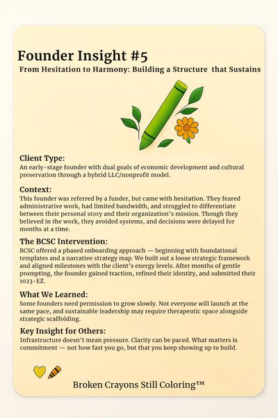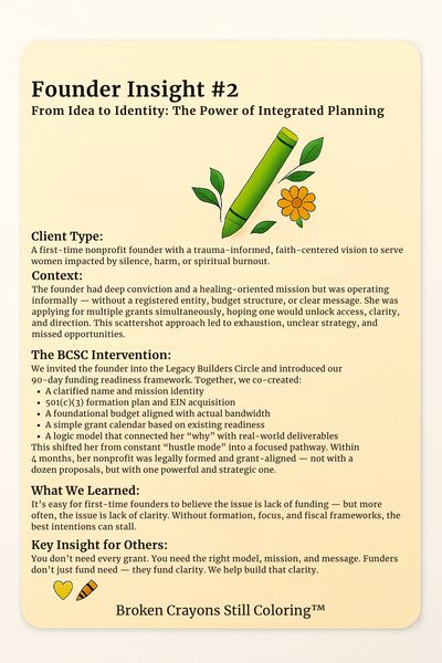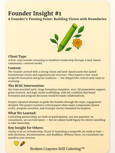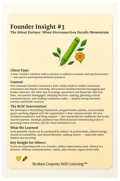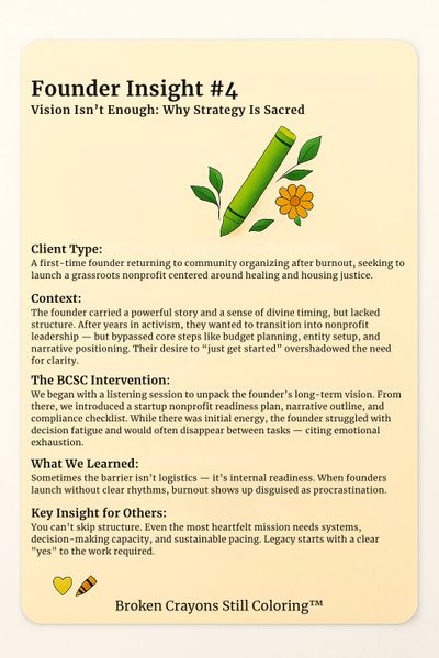 At Broken Crayons Still Coloring™, we share anonymized founder insights—real moments where clarity deepened, boundaries were tested, or the work paused altogether. These are not testimonials; they’re patterns and lessons to help future leaders choose alignment and structure over urgency. Legacy isn’t built in the spotlight—it’s built in the decision to keep coloring.